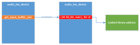 However, as we've seen before, the audio_hw_device structure contains many function pointers - all of whom point to the text segment of one of the loaded libraries. This means that reading any of these function pointers is sufficient for us to learn the location of the loaded libraries.