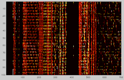 Moreover, typical heap objects appear to have many zeros within them, leading to some interesting repeatable patterns. Here is a heat-map generated from the aforementioned heap dump: