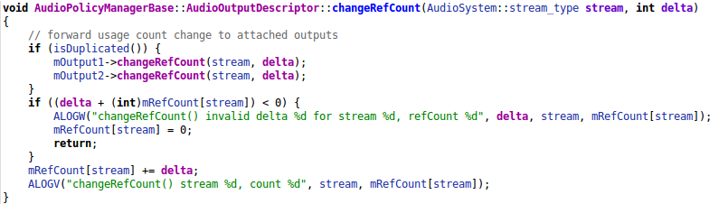 So, once more we access the mRefCount member of the AudioOutputDescriptor using the "stream" argument as a index (while performing no validation whatsoever). As we can see, there are two cases in which this function would return true: